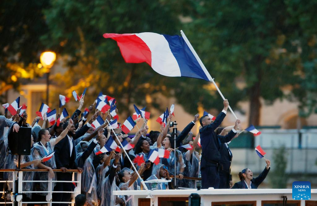 Members of the French delegation are seen during the opening ceremony of the Paris 2024 Olympic Games in Paris, France, July 26, 2024. (Xinhua/Fei Maohua)