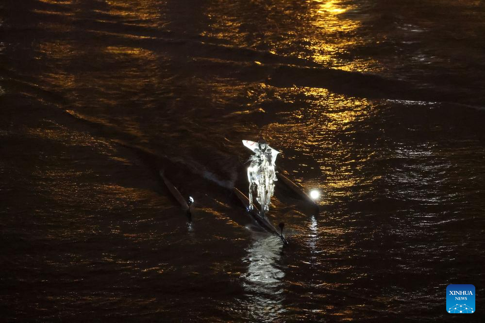 Floriane Issert, a Gendarmerie non-commissioned officer of the National Gendarmerie, rides on a mechanical metal horse up the Seine river, wrapped in the Olympic flag during the opening ceremony of the Paris 2024 Olympic Games in Paris, France, July 26, 2024. (Xinhua/Wan Xiang)