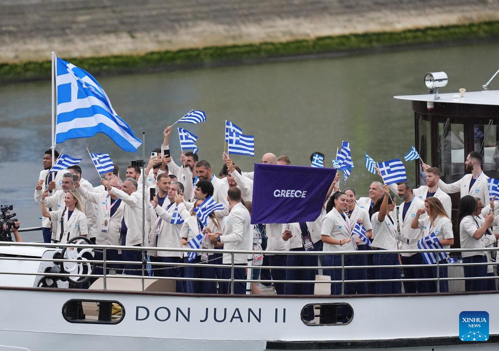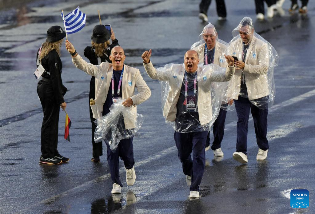 Members of the delegation of Greece are seen during the opening ceremony of the Paris 2024 Olympic Games in Paris, France, July 26, 2024. (Xinhua/Meng Yongmin)