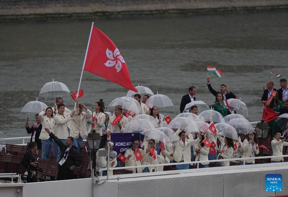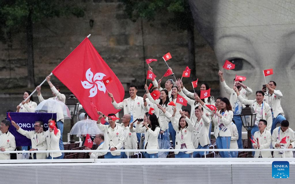 Members of the delegation of China's Hong Kong attend the opening ceremony of the Paris 2024 Olympic Games in Paris, France, July 26, 2024. (Xinhua/Jiang Wenyao)