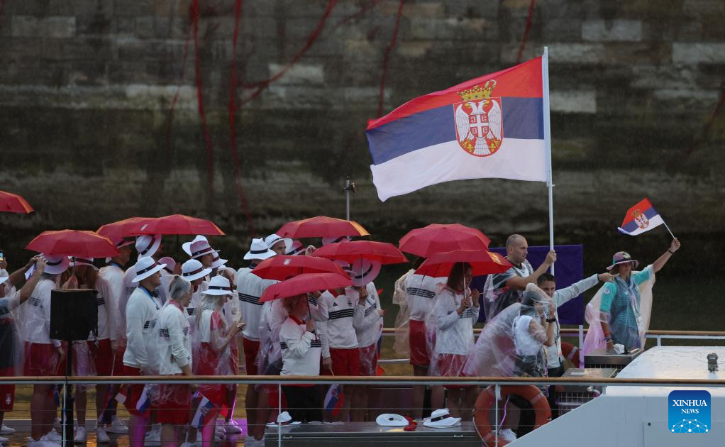 Members of the delegation of Serbia are seen during the opening ceremony of the Paris 2024 Olympic Games in Paris, France, July 26, 2024. (Xinhua/Wan Xiang)