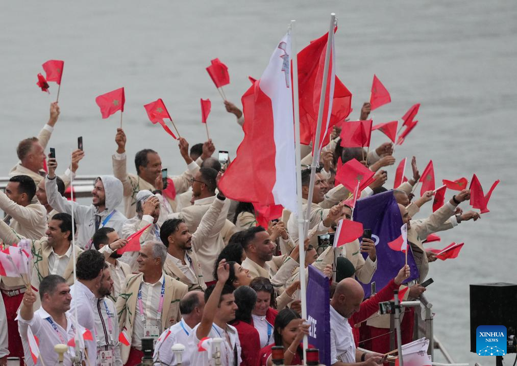 Members of the delegation of Morocco are seen during the opening ceremony of the Paris 2024 Olympic Games in Paris, France, July 26, 2024. (Xinhua/Wan Xiang)