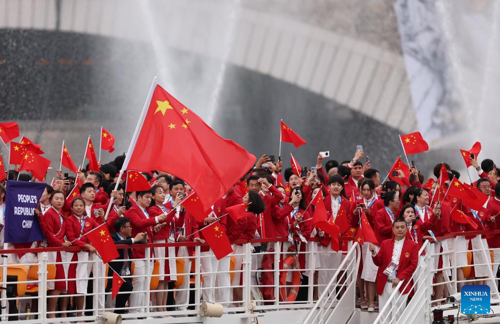 Members of the Chinese delegation attend the opening ceremony of the Paris 2024 Olympic Games in Paris, France, July 26, 2024. (Xinhua/Gao Jing)