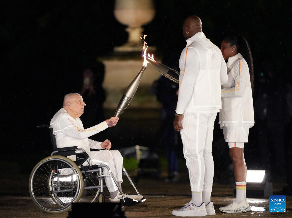 Charles Coste (L), the oldest French Olympic champion, passes the Olympic flame to torchbearers Marie-Jose Perec (R) and Teddy Riner during the opening ceremony of the Paris 2024 Olympic Games in Paris, France, July 26, 2024. (Xinhua/Du Yu)
