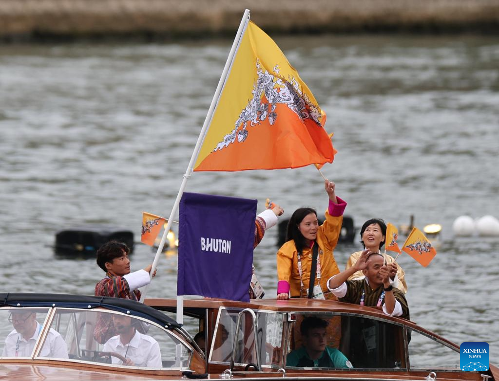 Members of the Bhutanese delegation attend the opening ceremony of the Paris 2024 Olympic Games in Paris, France, July 26, 2024. (Xinhua/Li Jing)