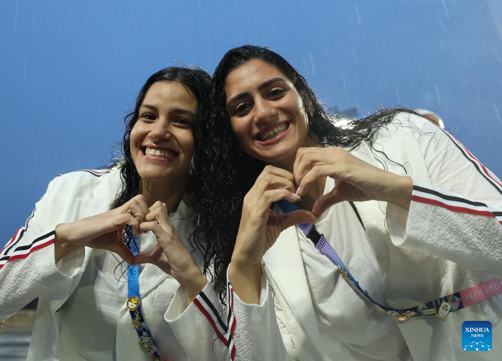 Members of the delegation of Egypt are seen during the opening ceremony of the Paris 2024 Olympic Games in Paris, France, July 26, 2024, as the Eiffel Tower is seen in the background. (Xinhua/Li Ming)