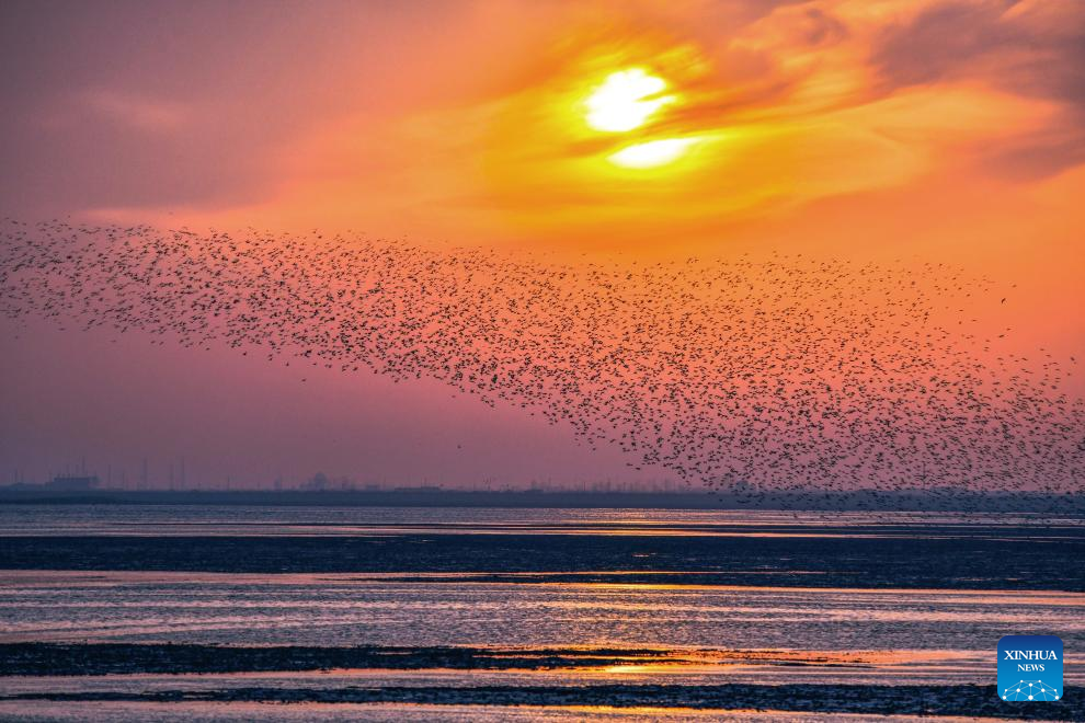 A flock of birds fly over a wetland at the mouth of the Yalujiang River in Dandong, northeast China's Liaoning Province, April 18, 2023. Five nominated sites of the migratory bird sanctuaries along the coast of Yellow Sea-Bohai Gulf of China successfully passed the review process Friday to be included on the World Heritage List by the United Nations Educational, Scientific and Cultural Organization (UNESCO).