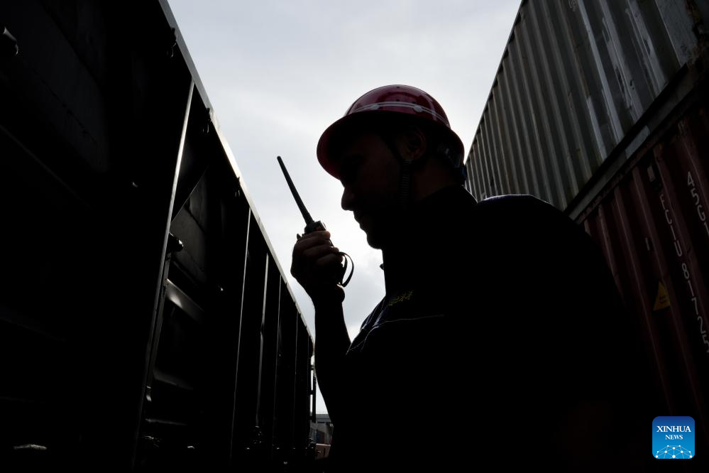 Bedelov Azilkhan talks with his colleagues via walkie-talkie at the China-Kazakhstan (Lianyungang) Logistics Cooperation Base in Lianyungang, east China's Jiangsu Province, July 25, 2024. (Xinhua/Li Bo)