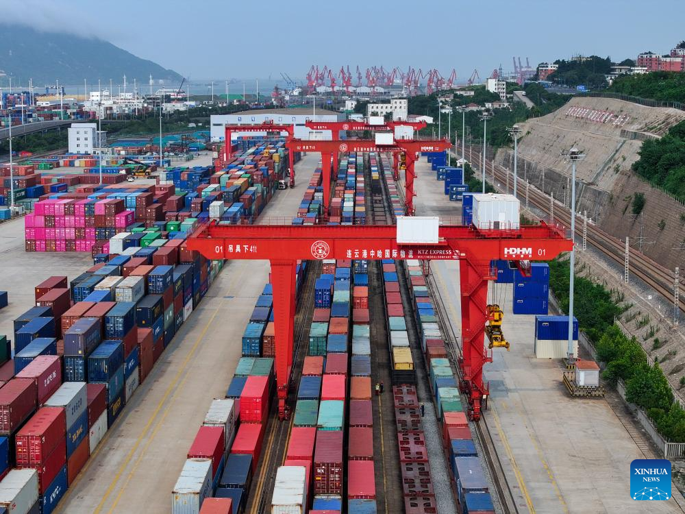 An aerial drone photo shows a container yard at the China-Kazakhstan (Lianyungang) Logistics Cooperation Base in Lianyungang, east China's Jiangsu Province, July 25, 2024. (Xinhua/Li Bo)