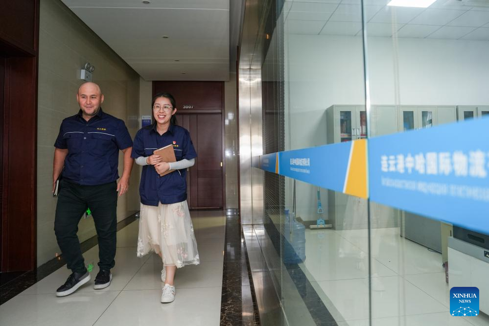 Bedelov Azilkhan (rear) and his colleague work at the China-Kazakhstan (Lianyungang) Logistics Cooperation Base in Lianyungang, east China's Jiangsu Province, July 25, 2024. (Xinhua/Li Bo)