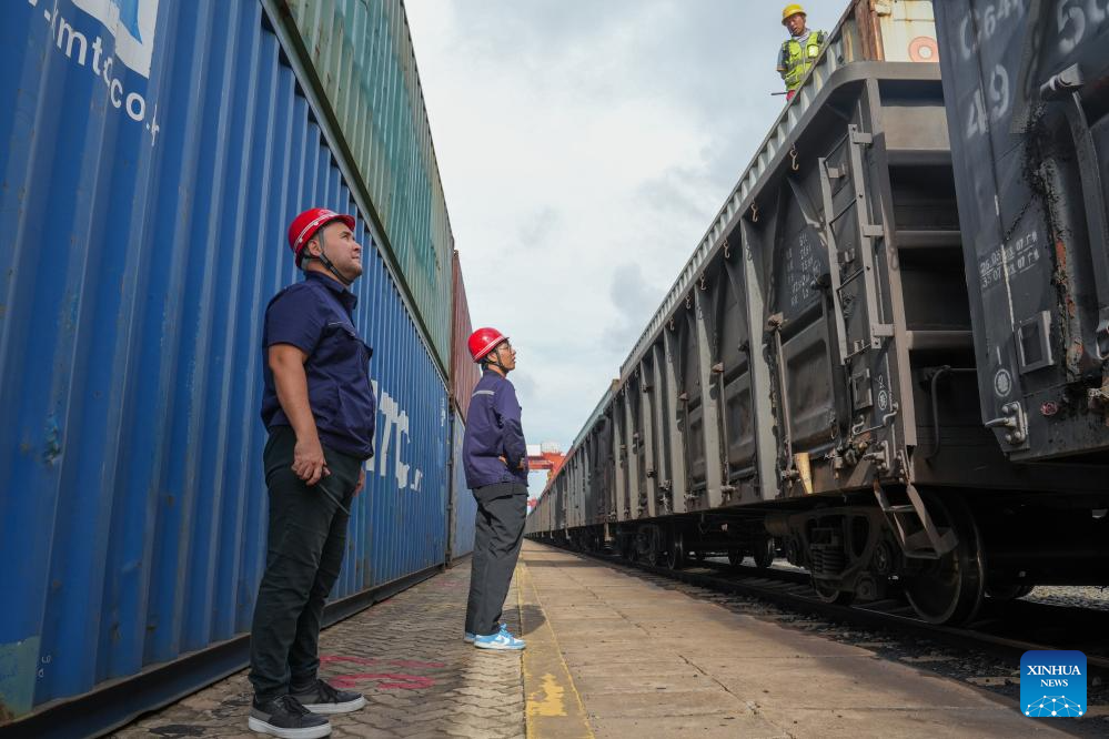 Bedelov Azilkhan (L) and his colleague check a container freight train at the China-Kazakhstan (Lianyungang) Logistics Cooperation Base in Lianyungang, east China's Jiangsu Province, July 25, 2024. (Xinhua/Li Bo)