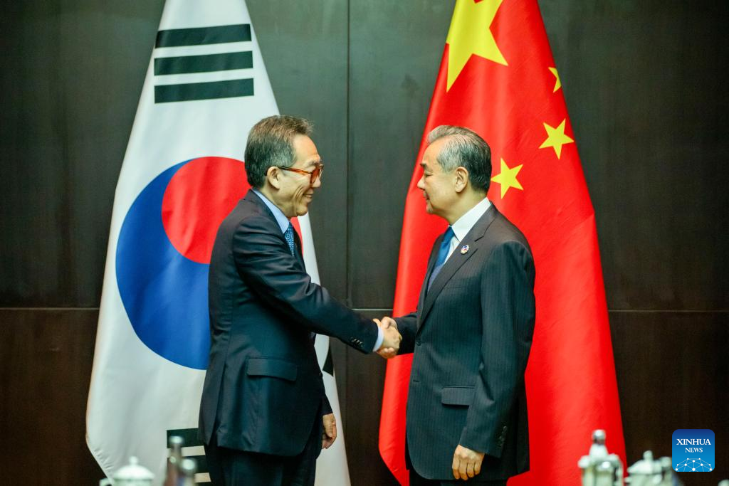Chinese Foreign Minister Wang Yi, also a member of the Political Bureau of the Communist Party of China Central Committee, meets with Cho Tae-yul, foreign minister of the Republic of Korea (ROK), in Vientiane, Laos, July 26, 2024. (Photo by Kaikeo Saiyasane/Xinhua)