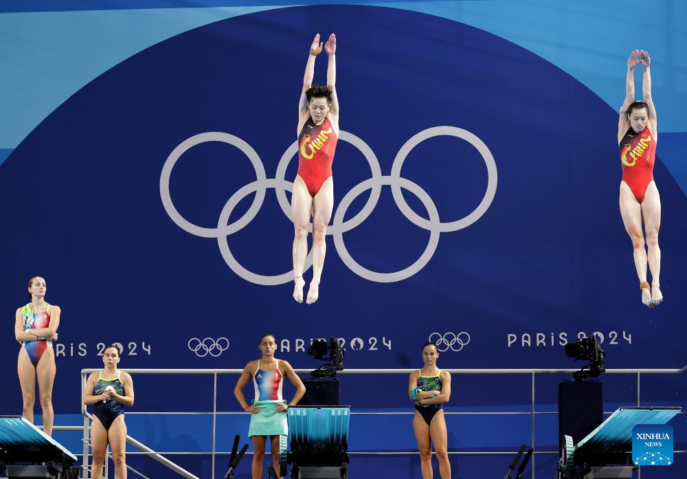 Chang Yani (R)/Chen Yiwen of China compete during the women's synchronised 3m springboard final of diving at the Paris 2024 Olympic Games in Saint Denis, near Paris, France, on July 27, 2024. (Xinhua/Li Ying)