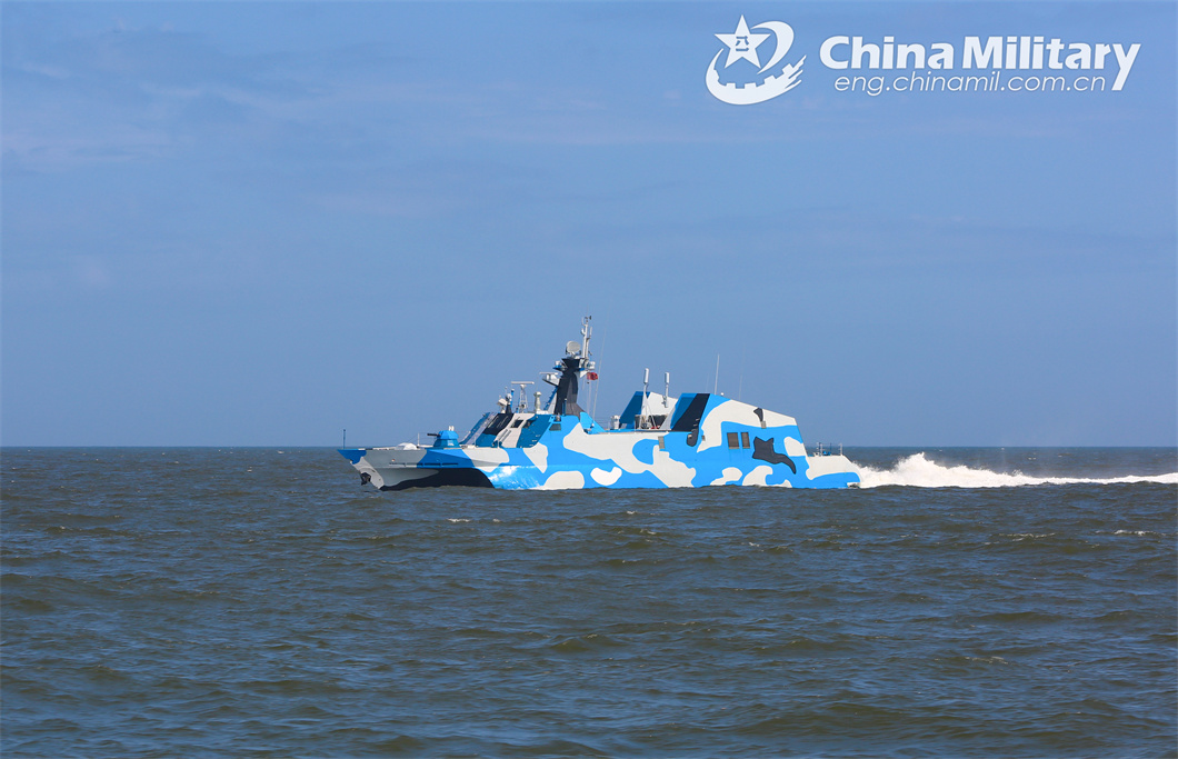 A fast attack missile boat attached to a group with the PLA Navy steams at sea during a recent maritime training exercise in waters of the East China Sea. (eng.chinamil.com.cn/Photo by Du Kecheng)