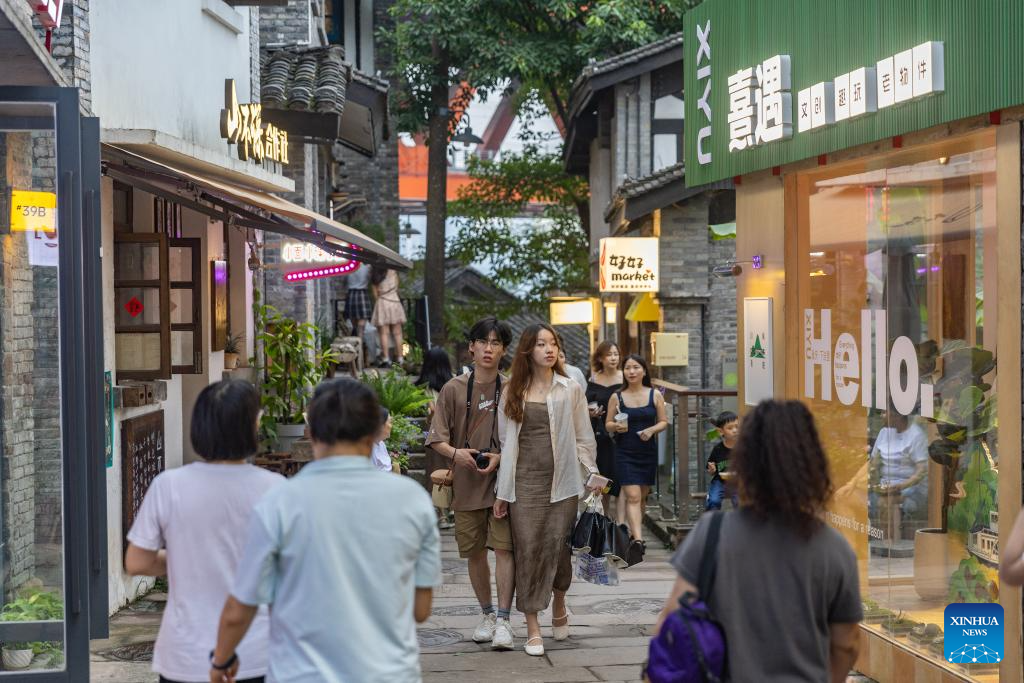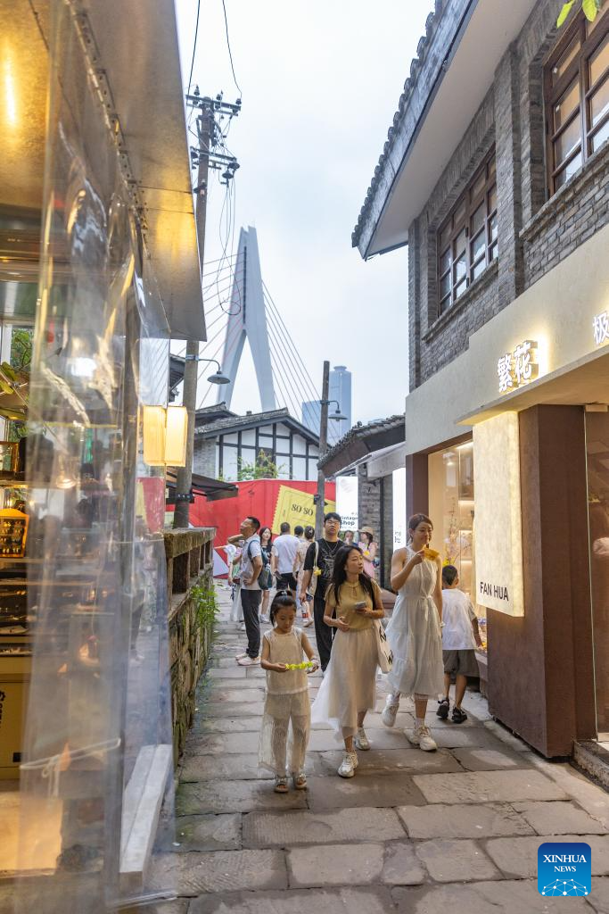 Tourists visit Longmenhao old street in Nan'an District in southwest China's Chongqing Municipality, July 28, 2024. Longmenhao old street, featuring more than 200 ancient architectures built in different forms and periods, was listed in the first batch of urban renewal pilot projects launched by Chongqing. In recent years, local authorities have been integrating natural, cultural, artistic, digital and other elements into the renovation of the street, and readjusting the layout according to its historical and cultural characteristics. The creative renovation and upgrading have incentivized young entrepreneurs, injected new vigor into the street and attracted more visitors. (Xinhua/Huang Wei)