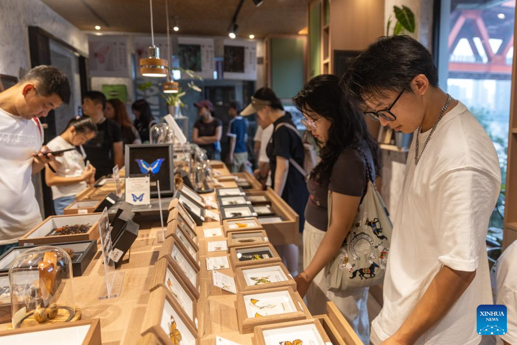 Tourists view specimens at a store on Longmenhao old street in Nan'an District in southwest China's Chongqing Municipality, July 28, 2024. Longmenhao old street, featuring more than 200 ancient architectures built in different forms and periods, was listed in the first batch of urban renewal pilot projects launched by Chongqing. In recent years, local authorities have been integrating natural, cultural, artistic, digital and other elements into the renovation of the street, and readjusting the layout according to its historical and cultural characteristics. The creative renovation and upgrading have incentivized young entrepreneurs, injected new vigor into the street and attracted more visitors. (Xinhua/Huang Wei)
