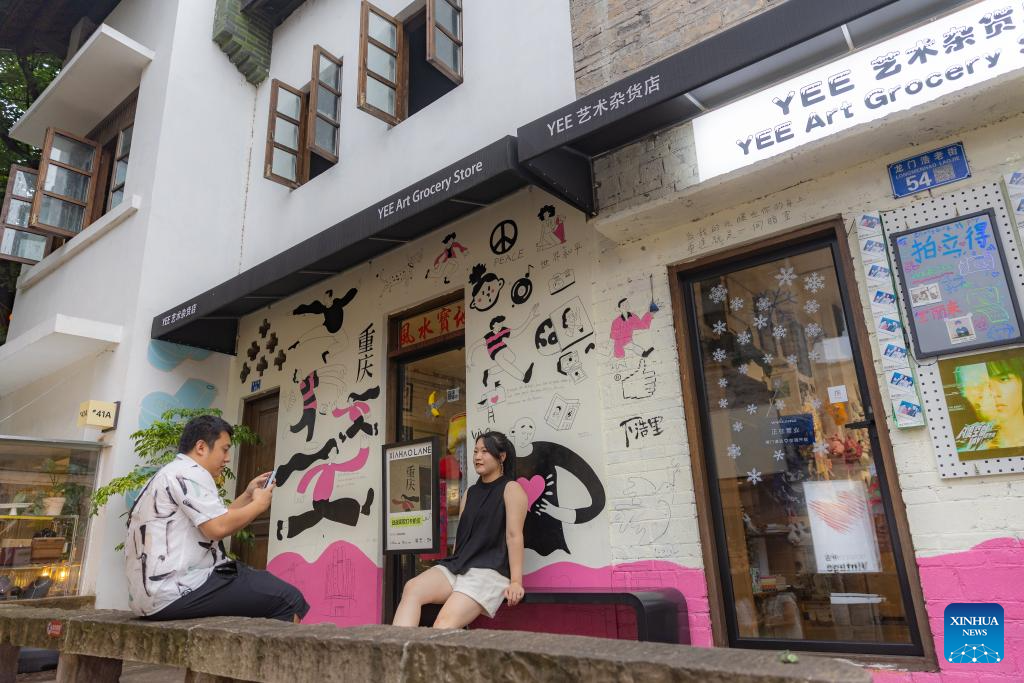 Tourists take photos outside an art grocery store on Longmenhao old street in Nan'an District in southwest China's Chongqing Municipality, July 28, 2024. Longmenhao old street, featuring more than 200 ancient architectures built in different forms and periods, was listed in the first batch of urban renewal pilot projects launched by Chongqing. In recent years, local authorities have been integrating natural, cultural, artistic, digital and other elements into the renovation of the street, and readjusting the layout according to its historical and cultural characteristics. The creative renovation and upgrading have incentivized young entrepreneurs, injected new vigor into the street and attracted more visitors. (Xinhua/Huang Wei)