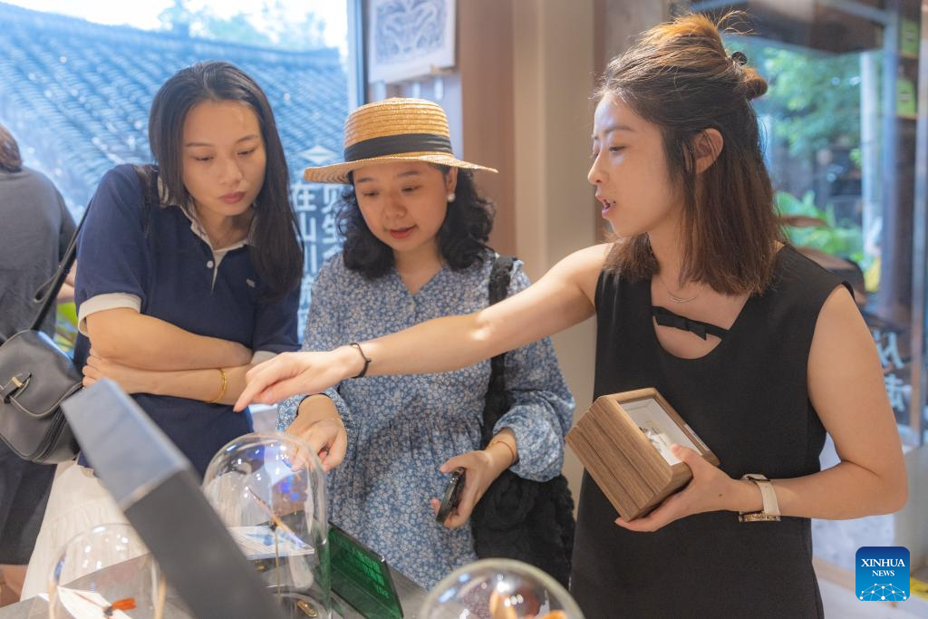Zeng Jin (1st R), a young entrepreneur, explains knowledge of specimen to tourists at her studio on Longmenhao old street in Nan'an District in southwest China's Chongqing Municipality, July 28, 2024. Longmenhao old street, featuring more than 200 ancient architectures built in different forms and periods, was listed in the first batch of urban renewal pilot projects launched by Chongqing. In recent years, local authorities have been integrating natural, cultural, artistic, digital and other elements into the renovation of the street, and readjusting the layout according to its historical and cultural characteristics. The creative renovation and upgrading have incentivized young entrepreneurs, injected new vigor into the street and attracted more visitors. (Xinhua/Huang Wei)