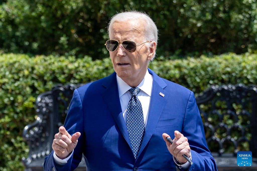 U.S. President Joe Biden speaks to reporters as he walks toward the South Lawn to board Marine One at the White House in Washington, D.C., the United States, on July 29, 2024. (Xinhua/Hu Yousong)