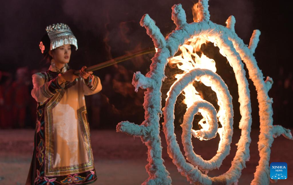 Actors perform during the annual Torch Festival of Yi ethnic group held in Weining County, southwest China's Guizhou Province, July 29, 2024. (Xinhua/Yang Wenbin)