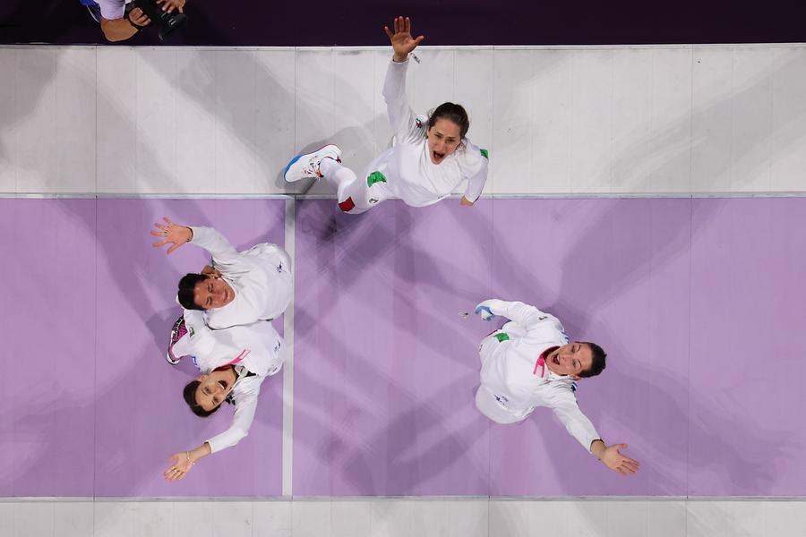 Team Italy celebrate after winning the women's epee team gold medal match of fencing between France and Italy at the Paris 2024 Olympic Games in Paris, France, on July 30, 2024. (Xinhua/Xu Zijian)