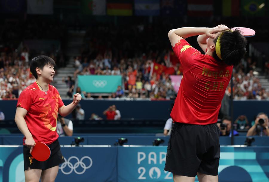 Wang Chuqin (R)/Sun Yingsha of China celebrate winning the mixed doubles gold medal table tennis match between Wang Chuqin/Sun Yingsha of China and Ri Jong Sik/Kim Kum Yong of the Democratic People's Republic of Korea at the Paris 2024 Olympic Games in Paris, France, on July 30, 2024. (Xinhua/Wang Dongzhen)