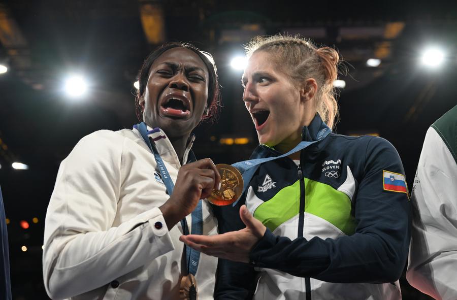 Bronze medalist Clarisse Agbegnenou (L) of France make faces while holding the medal of gold medalist Andreja Leski during the victory ceremony of the judo women -63kg at the Paris 2024 Olympic Games in Paris, France, July 30, 2024. (Xinhua/Wu Wei)