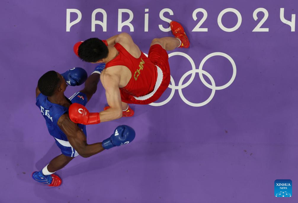 Tanglatihan Tuohetaerbieke (R) of China competes against Cristian Javier Pinales of the Dominican Republic during the men's 80kg preliminaries round of 16 of boxing at the Paris 2024 Olympic Games in Paris, France, July 30, 2024. (Xinhua/Guo Yu)