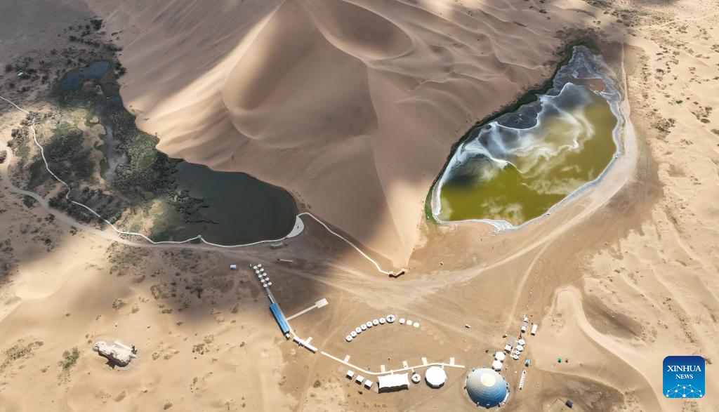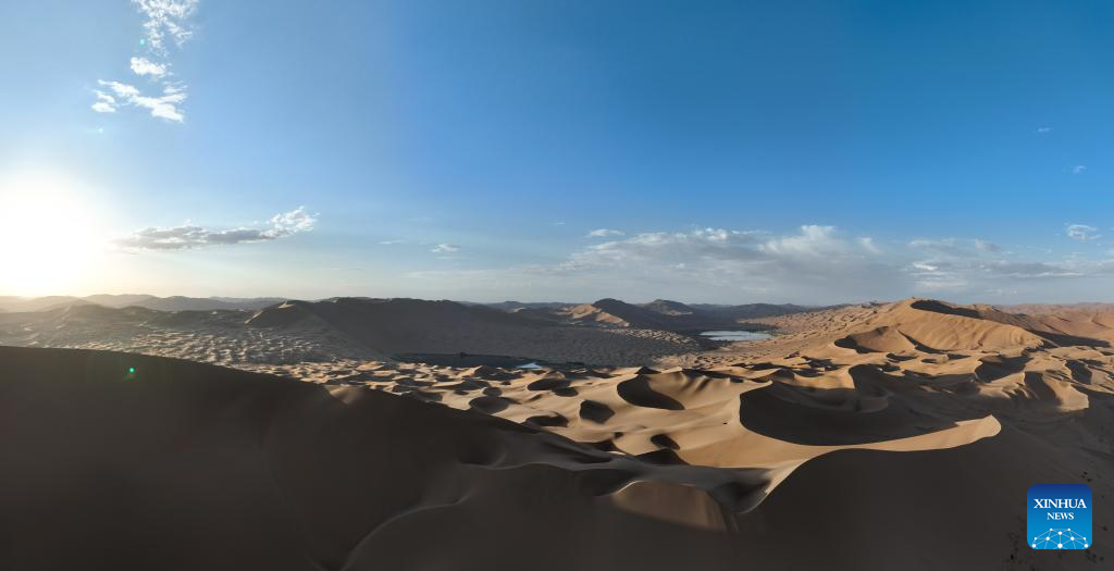An aerial panoramic photo taken on July 31, 2024 shows a lake in the Badain Jaran Desert in north China's Inner Mongolia Autonomous Region. Located in the hyper-arid region of northwestern China, the Badain Jaran Desert is the country's third largest desert and second largest drifting desert.