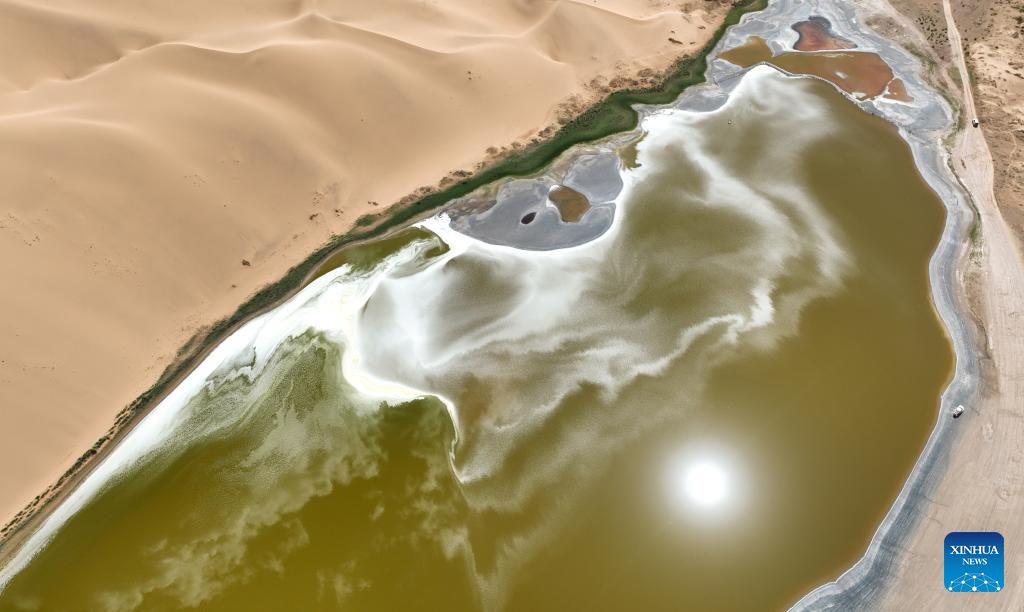 An aerial drone photo taken on July 31, 2024 shows a lake in the Badain Jaran Desert in north China's Inner Mongolia Autonomous Region. Located in the hyper-arid region of northwestern China, the Badain Jaran Desert is the country's third largest desert and second largest drifting desert.
