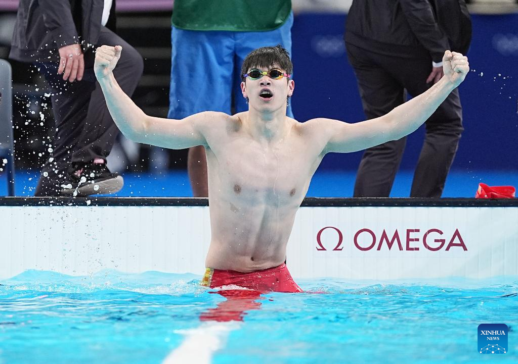 Pan Zhanle of China celebrates after the men's 100m freestyle final of swimming at Paris 2024 Olympic Games in Paris, France, on July 31, 2024. (Xinhua/Du Yu)