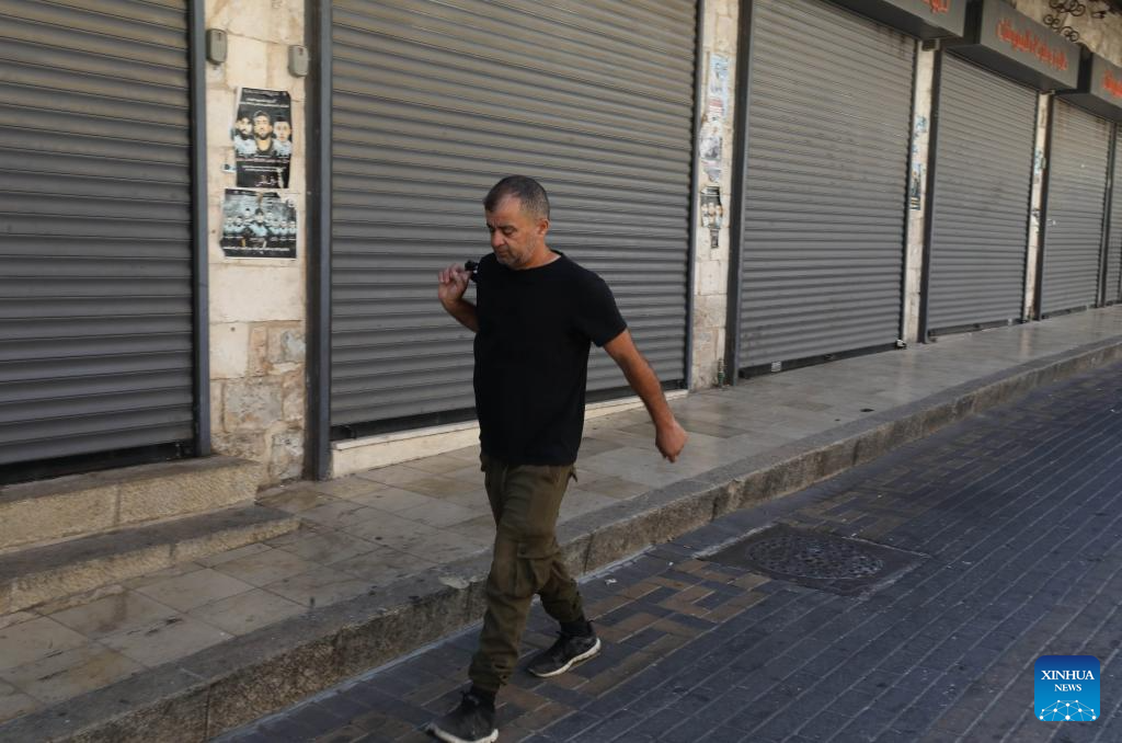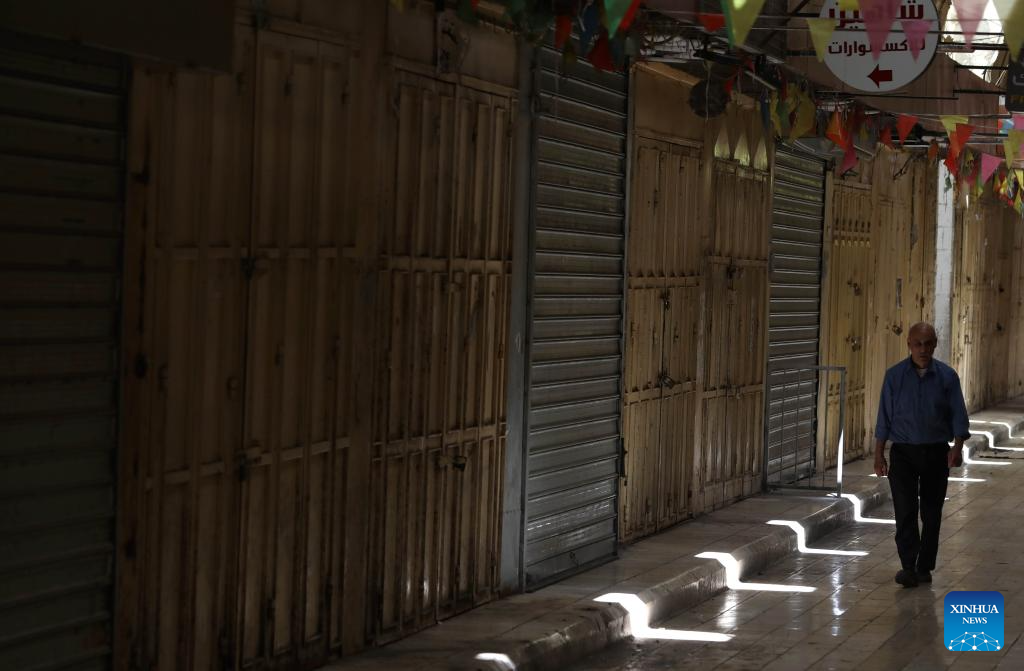 A man walks past closed shops during a general strike in the West Bank city of Nablus, on July 31, 2024. The Palestinian National and Islamic Forces on Wednesday declared a general strike across Palestine, condemning the assassination of Hamas Politburo Chief Ismail Haniyeh. (Photo by Ayman Nobani/Xinhua)
