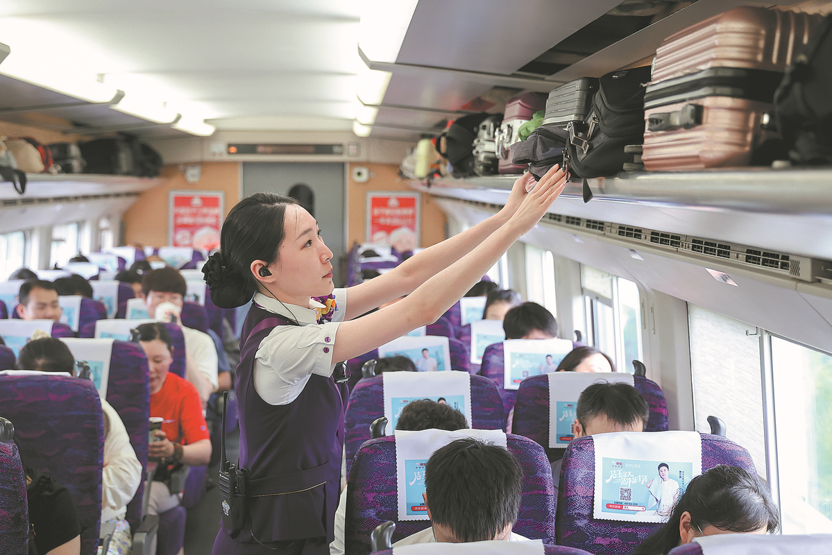 An attendant sorts luggage on train G8389 on July 15. (Photo/Xinhua)