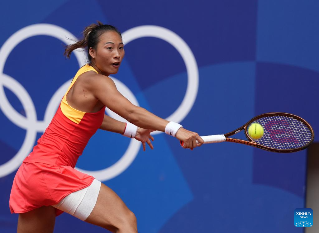 Zheng Qinwen of China competes during the women's singles semi-final match of tennis between Zheng Qinwen of China and Iga Swiatek of Poland at the Paris 2024 Olympic Games in Paris, France, on Aug. 1, 2024. (Xinhua/Wan Xiang)
