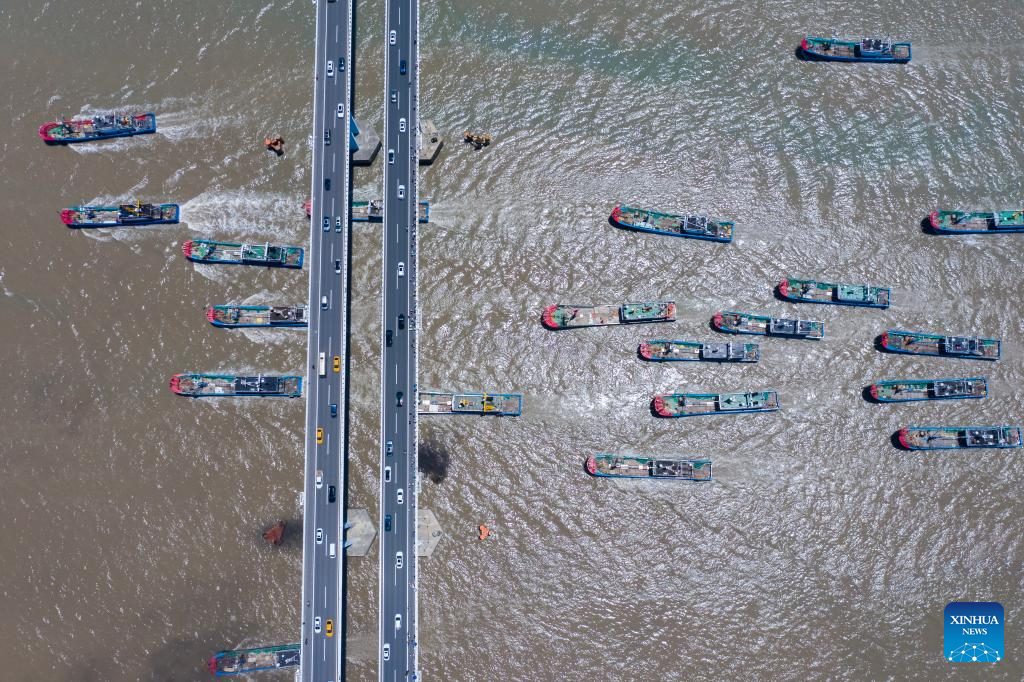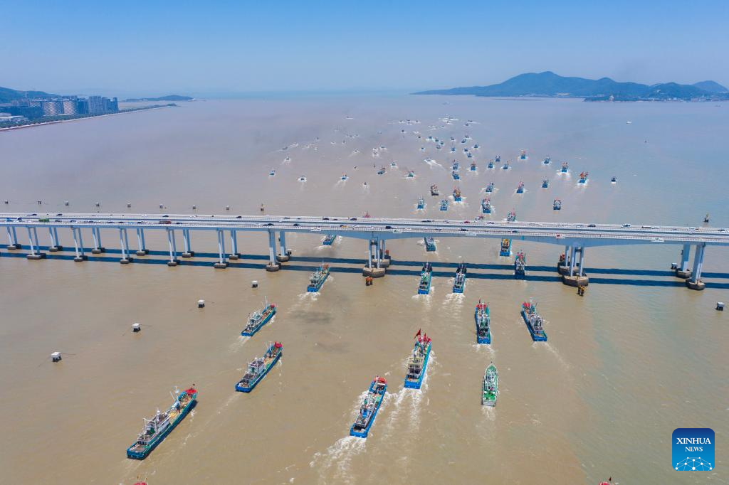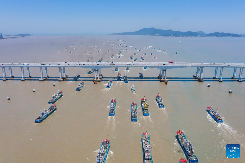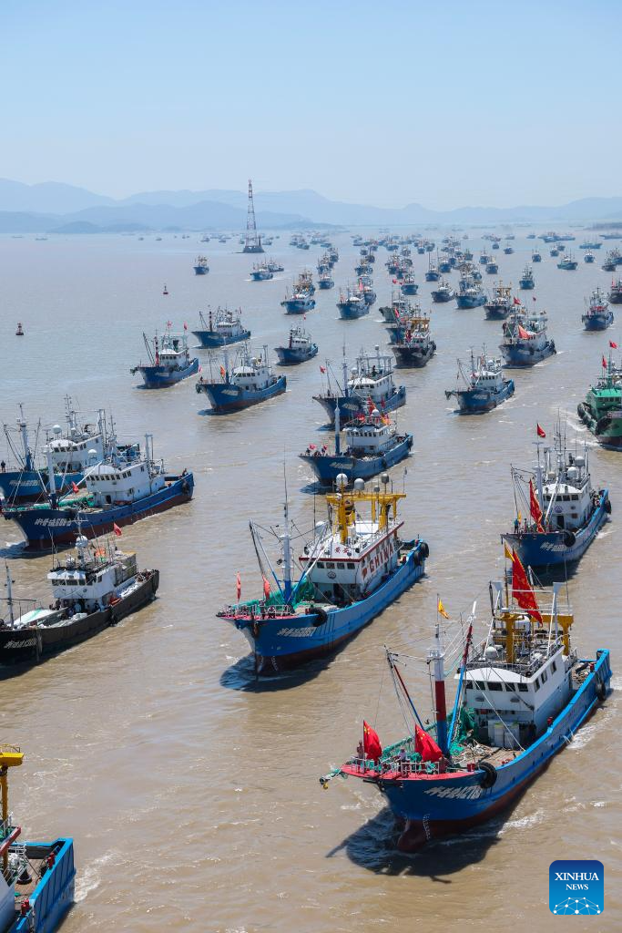 A drone photo taken on Aug. 1, 2024 shows fishing boats departing for fishing from the Shenjiamen fishing port in Zhoushan City, east China's Zhejiang Province. Four types of fishing boats with special permission set sail on Thursday after a three-month summer fishing ban in the East China Sea. (Xinhua/Xu Yu)