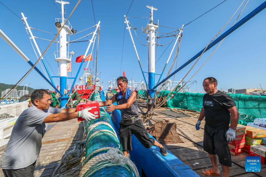 Fishermen prepare for fishing at the Shenjiamen fishing port in Zhoushan City, east China's Zhejiang Province, July 31, 2024. Four types of fishing boats with special permission set sail on Thursday after a three-month summer fishing ban in the East China Sea. (Xinhua/Xu Yu)