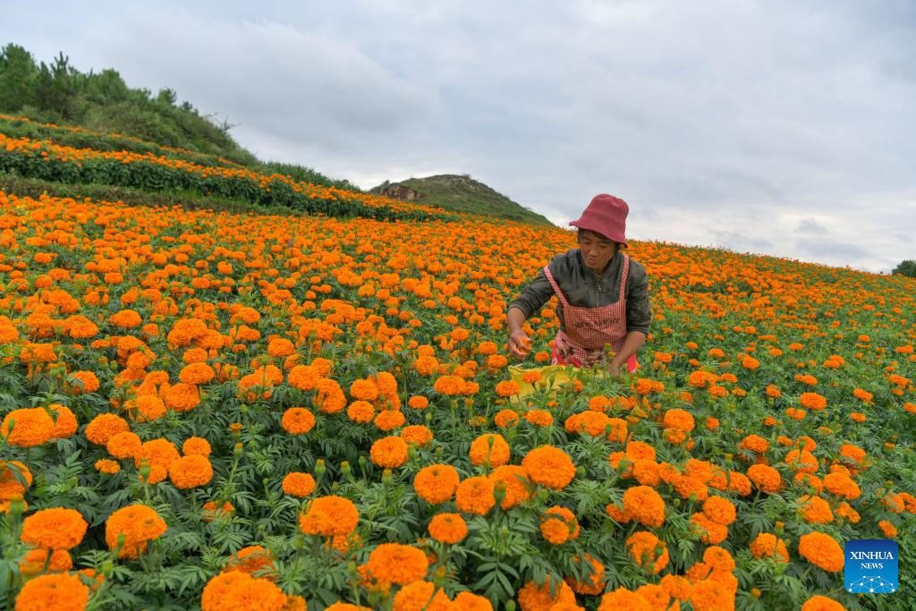 A villager picks marigold flowers at Gaopo Village of Weining County, southwest China's Guizhou Province, July 30, 2024. More than 5,000 mu (about 333.3 hectares) of marigolds planted in Weining are in full bloom. Local planting cooperatives have been working with pharmaceutical enterprises to develop marigold planting, and to help farmers increase their income. Marigold is a raw material for herbal medicine. (Xinhua/Yang Wenbin)