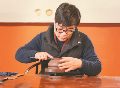 Xie Qiang, a national-level master of arts and crafts and provincial-level inheritor of the technique of making Yixing purple clay pottery, works on a purple clay teapot. (Photo courtesy of the interviewee)