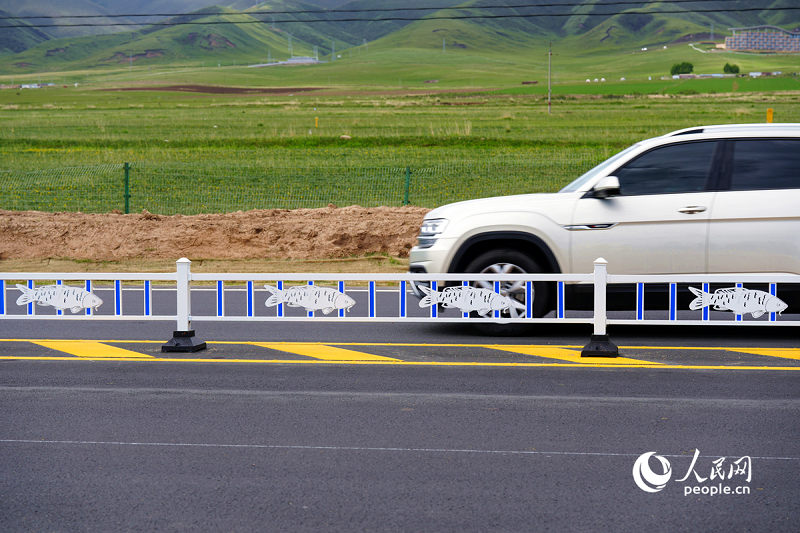 Photo shows road barriers featuring patterns of the naked carp, which is endemic to the Qinghai Lake. (People’s Daily Online/Yang Qihong)
