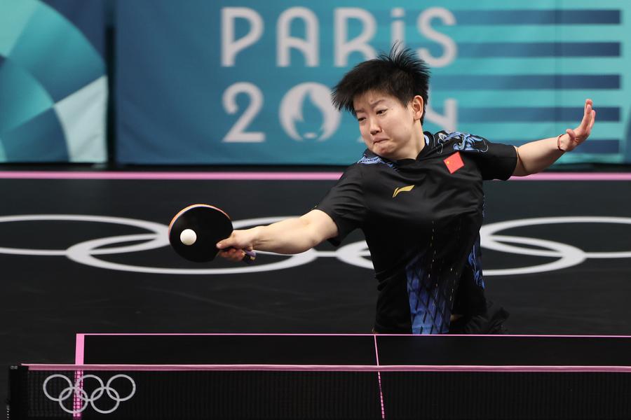 Sun Yingsha of China in action during the women's singles semifinal match of table tennis against Hayata Hina of Japan at the Paris 2024 Olympic Games on Aug. 2, 2024. (Xinhua/Liu Xu)