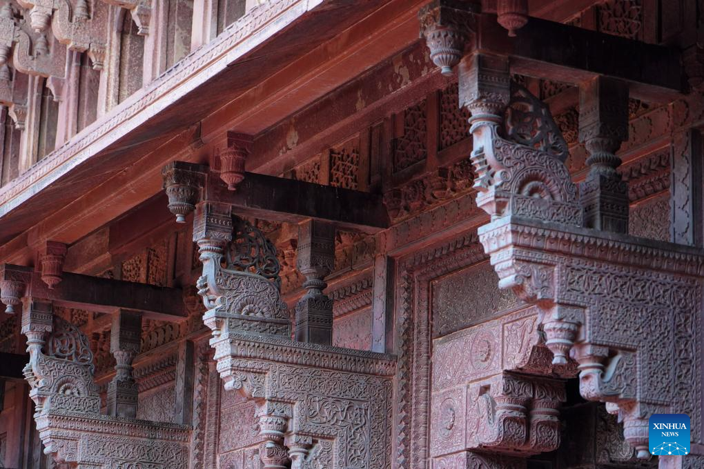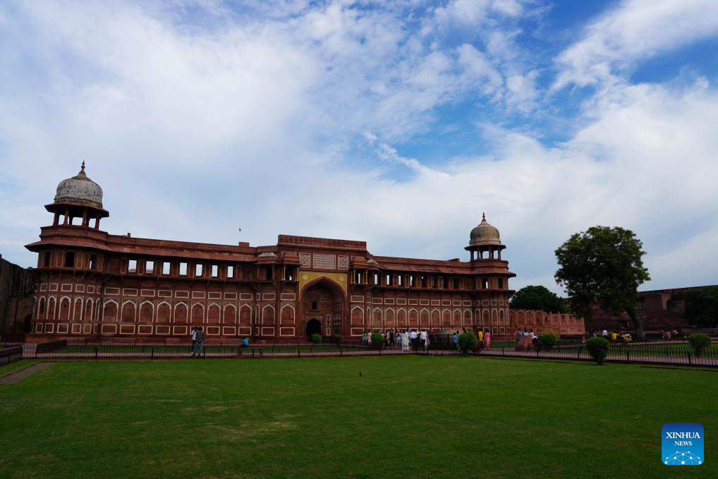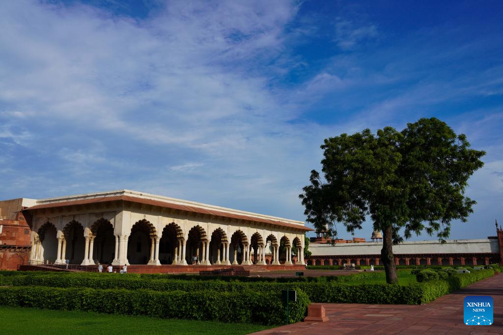 This photo taken on Aug. 3, 2024 shows a view at the Red Fort of Agra in Agra, India. Near the gardens of the Taj Mahal stands the 16th-century Mughal monument known as the Red Fort of Agra. This fortress of red sandstone encompasses, within its 2.5-km-long enclosure walls, the imperial city of the Mughal rulers. It was listed as a World Heritage Site by the UNESCO in 1983. (Xinhua/Chen Dongshu)