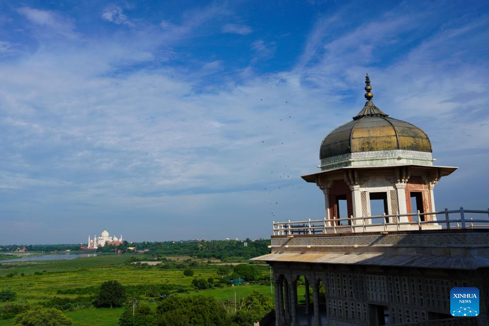 This photo taken on Aug. 3, 2024 shows a view of Taj Mahal seen from the Red Fort of Agra in Agra, India. Near the gardens of the Taj Mahal stands the 16th-century Mughal monument known as the Red Fort of Agra. This fortress of red sandstone encompasses, within its 2.5-km-long enclosure walls, the imperial city of the Mughal rulers. It was listed as a World Heritage Site by the UNESCO in 1983. (Xinhua/Wu Yue)