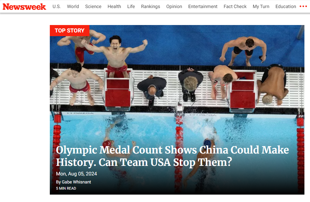 According to the Newsweek, a weekly news magazine based in New York City, "China has a chance to make history as the only modern country, apart from the United States, to top the gold medal table without the advantage of competing on its home soil" in the Paris Olympics.