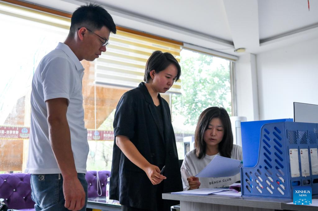 Li Fang (C) talks with colleagues at an office at the Yinkentala Desert scenic spot in Dalad Banner, north China's Inner Mongolia Autonomous Region, July 31, 2024.(Xinhua/Li Zhipeng)