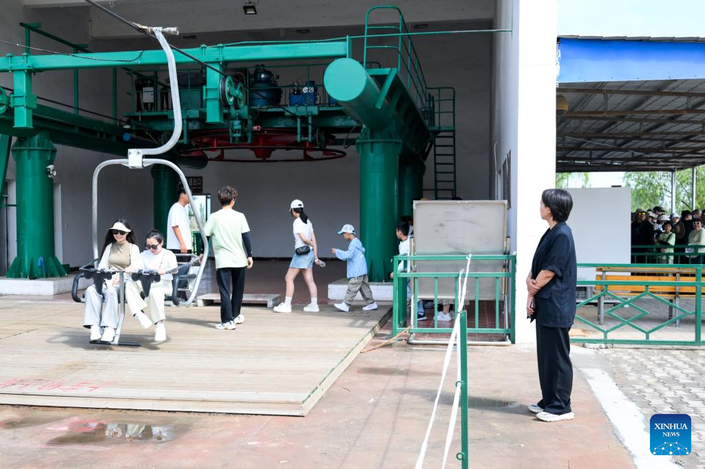 Li Fang (R) watches over the operation of cableway at the Yinkentala Desert scenic spot in Dalad Banner, north China's Inner Mongolia Autonomous Region, July 31, 2024.(Xinhua/Li Zhipeng)