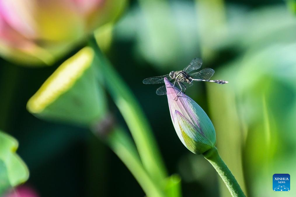 A dragonfly falls on a lotus in a pond in Changning, central China's Hunan Province, Aug. 5, 2024. (Photo by Zhou Xiuyuchun/Xinhua)