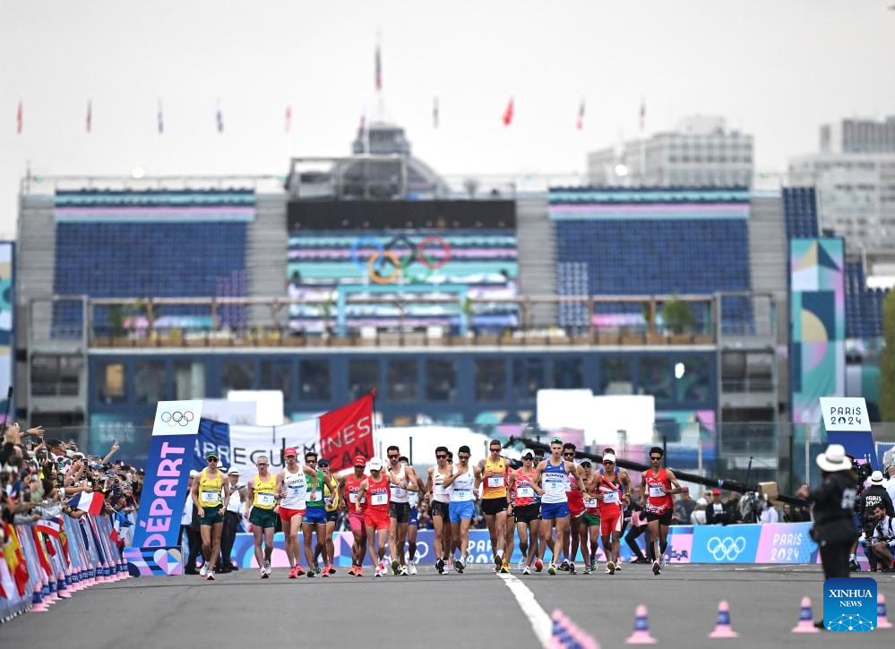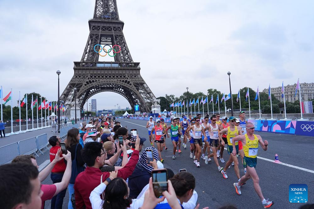 Athletes compete during the marathon race walk relay mixed of Athletics at the Paris 2024 Olympic Games in Paris, France, Aug. 7, 2024. (Xinhua/Xu Chang)