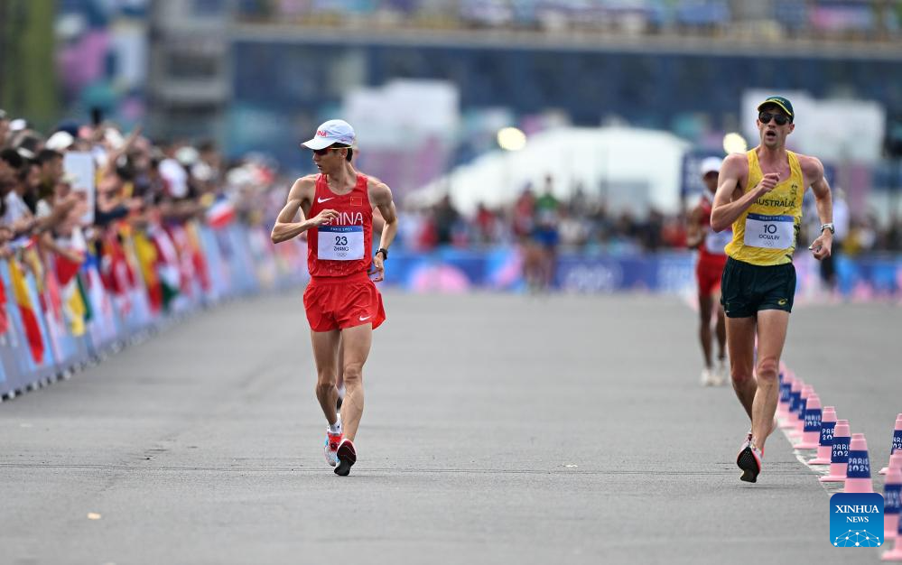Zhang Jun (L) of China competes during the marathon race walk relay mixed of Athletics at the Paris 2024 Olympic Games in Paris, France, Aug. 7, 2024. (Xinhua/Song Yanhua)