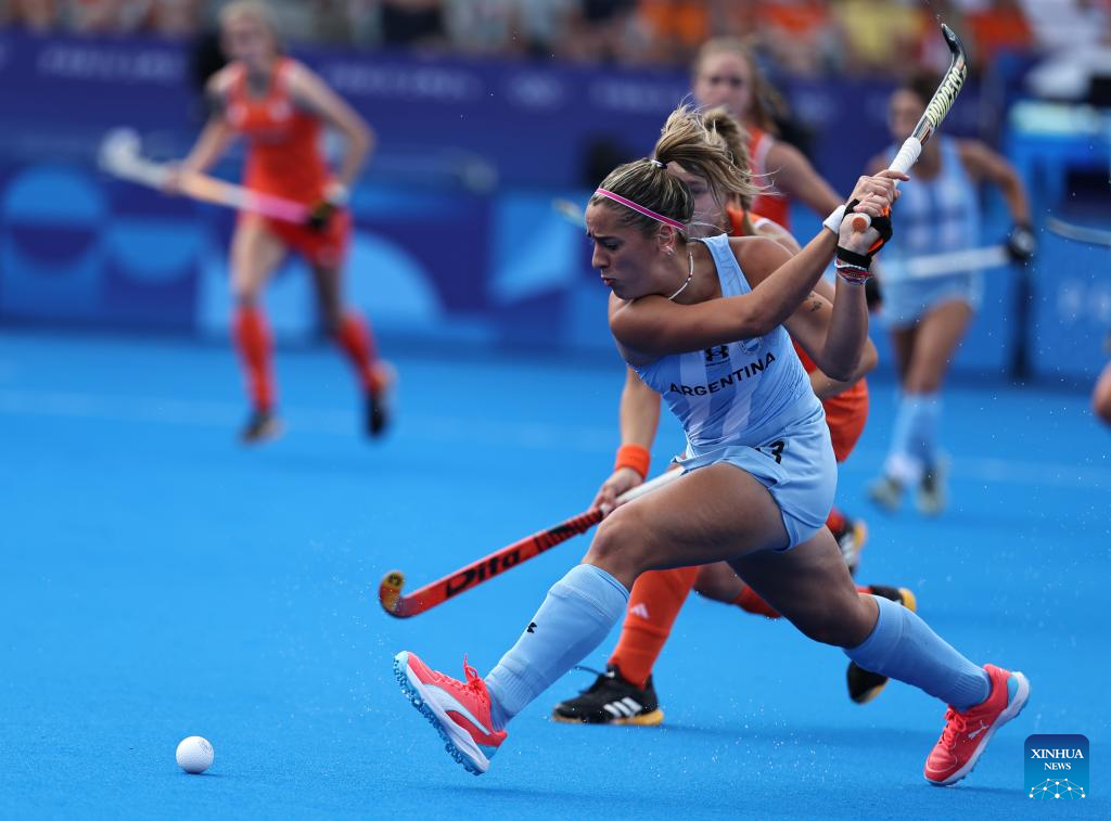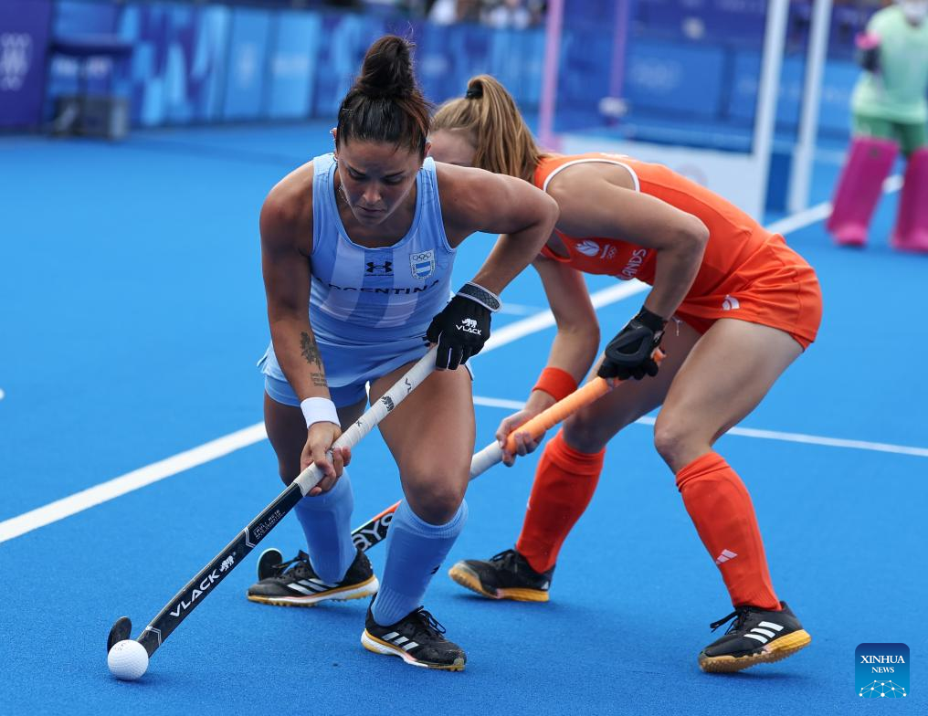 Maria Granatto (L) of Argentina vies for the ball during the women's hockey semi-final match between the Netherlands and Argentina at the Paris 2024 Olympic Games in Colombes, France, Aug. 7, 2024. (Xinhua/Ren Pengfei)