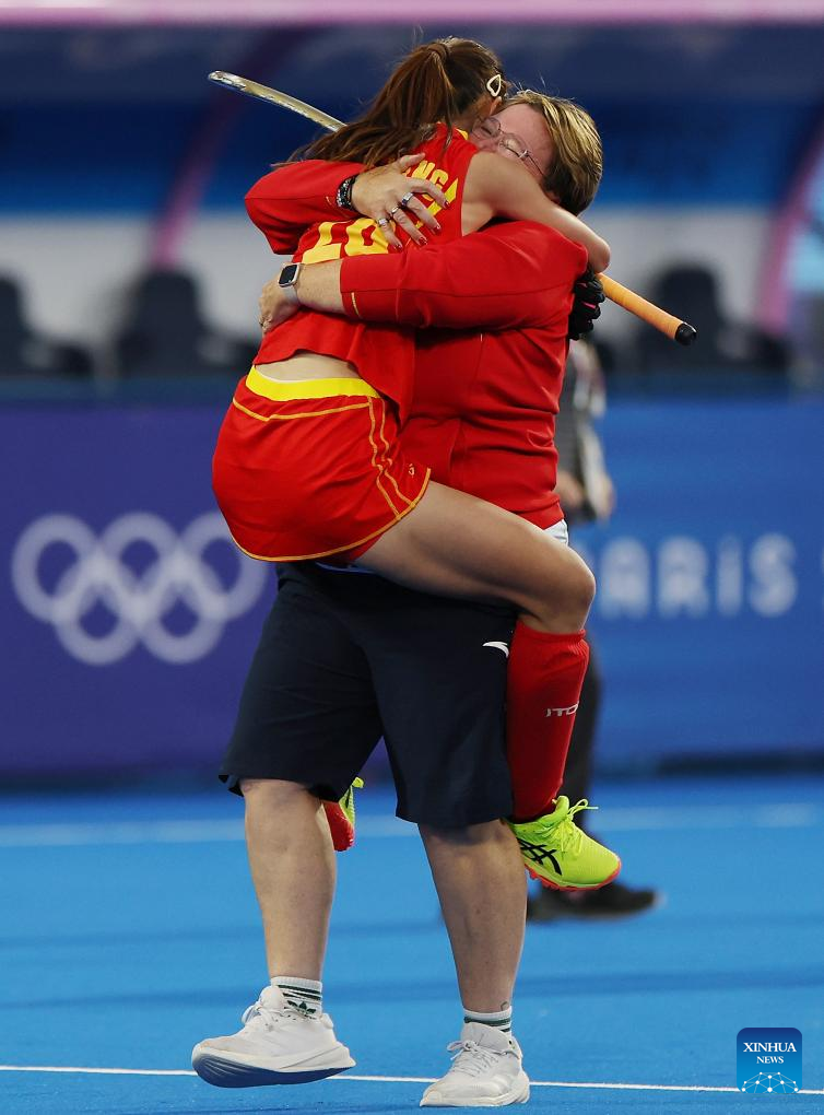 Head coach Alyson Regina Annan (R) of China hugs team player Chen Yang in celebration of victory in the women's hockey semi-final match between China and Belgium at the Paris 2024 Olympic Games in Colombes, France, Aug. 7, 2024. (Xinhua/Ren Pengfei)